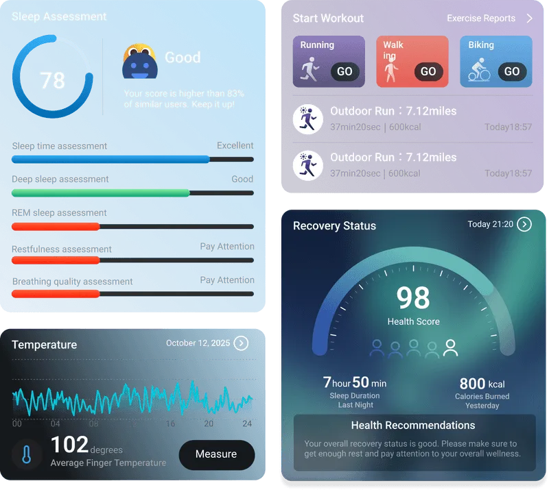 From the moment you wake up to your last step of the day, the companion app turns your data into deep, actionable insights. Sleep quality. Recovery readiness. Workout performance. Even subtle changes in your body temperature — all in one seamless, intuitive interface.